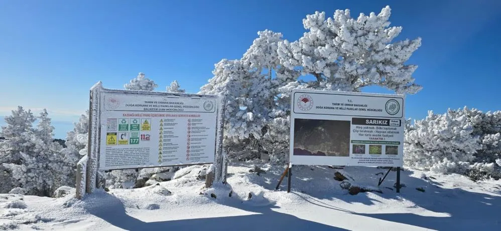 Balıkesir'in Edremit ilçesinde yer alan ve "harikalar diyarı" olarak nitelendirilen Kazdağı Milli Parkı, eşsiz coğrafi yapısı ve barındırdığı endemik bitki zenginliğiyle dikkat çekiyor. Kazdağları'nın karla kaplı zirvesi Sarıkız Tepesi dron kamerası ile görüntülendi.