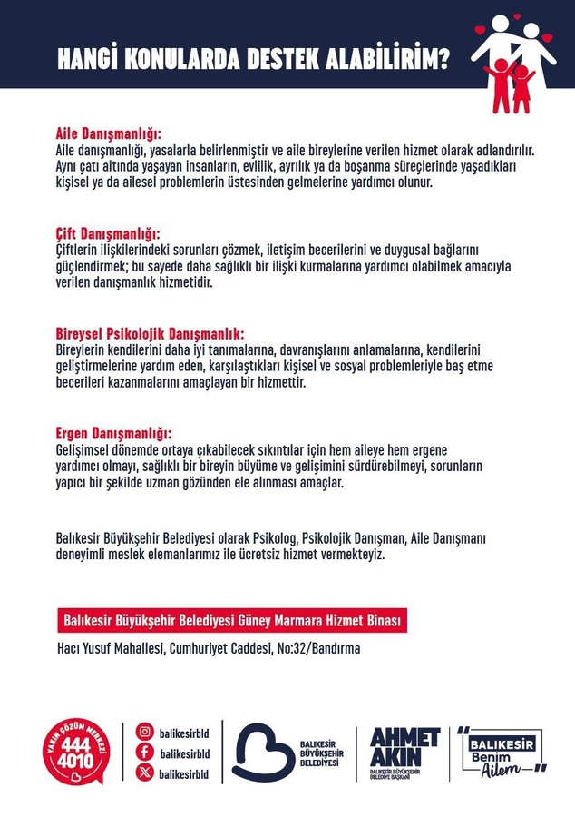 Balıkesir Büyükşehir Belediyesi, “Balıkesir Benim Ailem” anlayışı ile insan odaklı yatırımları hayata geçirmeye devam ediyor. Toplumun her kesimine dokunan, yaşam kalitesini artırmaya yönelik hizmetleri yaygınlaştırmayı hedefleyen Büyükşehir Belediyesi, psikolojik destek çalışmalarını da bu vizyon doğrultusunda güçlendiriyor. Bu çerçevede, ücretsiz psikolojik danışmanlık desteği Bandırma’da uygulamaya alınırken, çok yakında Manyas’ta da vatandaşlarla buluşacak.