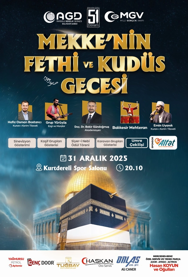 Programı: 31 Aralık 2025’te Kurtdereli Kapalı Spor Salonu’nda! Anadolu Gençlik Derneği (AGD) ve Milli Gençlik Vakfı (MGV), geleneksel hale gelen Mekke’nin Fethi ve Kudüs Gecesi programını bu yıl da geniş katılımla gerçekleştirmeye hazırlanıyor.