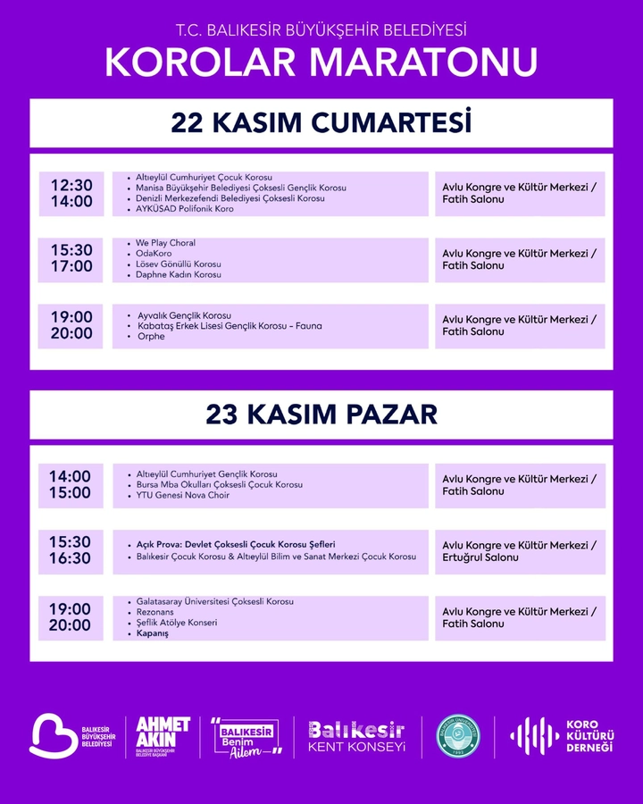İki gün boyunca 18 koro ve 750 korist, Balıkesir’de koro müziğinin renkli dünyasını izleyenlere sunacak. Programda konserlerin yanı sıra, meraklılarına ilham verecek atölyeler ve söyleşiler de yer alıyor. Zengin programıyla ziyaretçilere hem yeni korolar tanıma hem de koro müziği alanında ilham verici içeriklere erişme fırsatı sunuyor. Ayrıca ülkemizde koro müziği ve koro eğitimine büyük katkıları olan koro müziği uzmanları da deneyimlerini paylaşmak için maraton kapsamında Balıkesir’e gelecek.