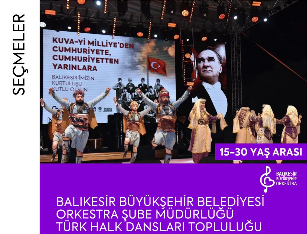 Balıkesir Büyükşehir Belediyesi, Orkestra Şube Müdürlüğü bünyesinde Türk Halk Dansları Topluluğu kuruyor. Seçmelerin başladığı alımlara 15-30 yaş aralığındaki gönüllü herkes Orkestra Şube Müdürlüğü’ne şahsen başvuru yaparak topluluğa katılım sağlayabilecek. Kurulan dans topluluğu, Balıkesir Büyükşehir Belediyesini yurtiçi ve yurtdışındaki festival, gösteri ve yarışmalarda temsil ederek Balıkesir’in kültürel değerlerini yaşatmayı hedefliyor.