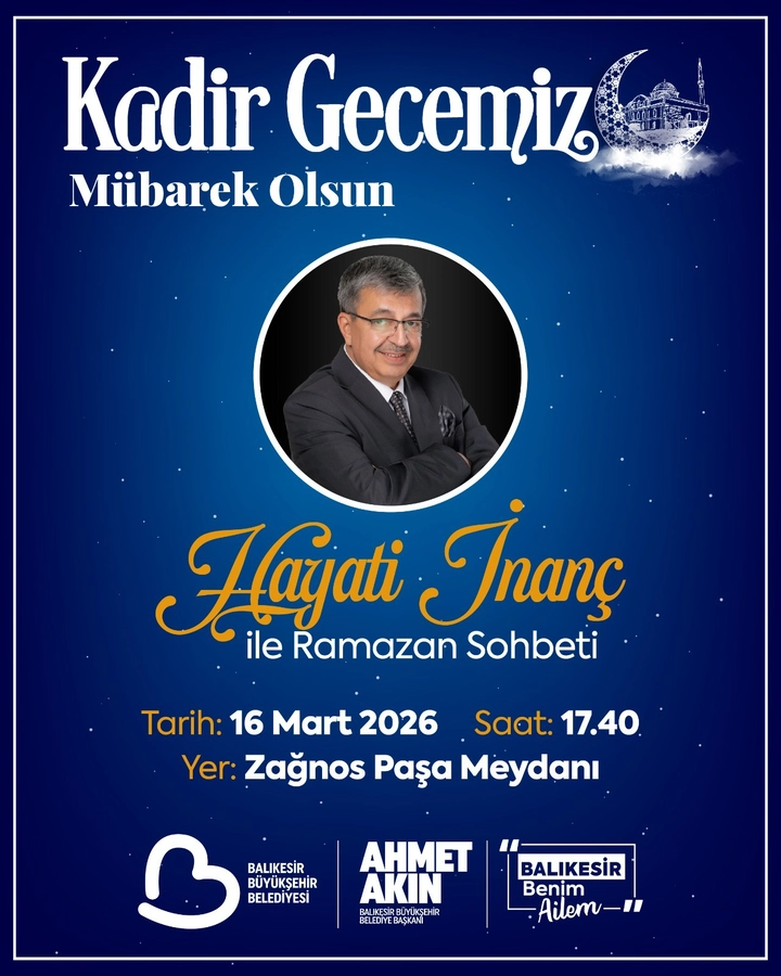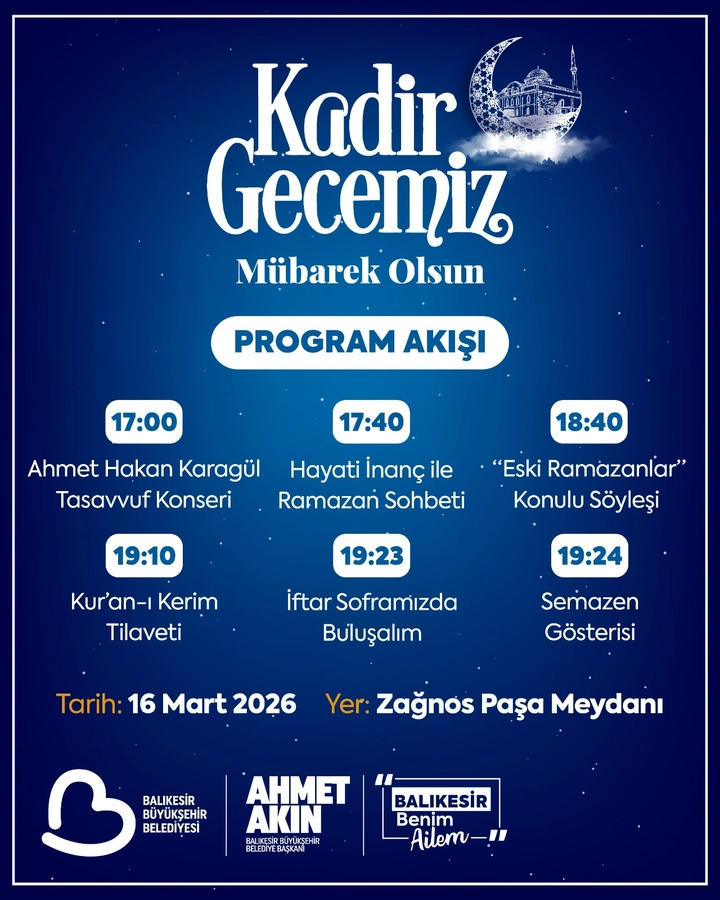 Balıkesir Büyükşehir Belediye Başkanı Ahmet Akın, Kadir Gecesi’nde tüm hemşehrilerini Zağnos Paşa Meydanında düzenlenecek kapsamlı bir programda buluşturacak. Yaklaşık 30 bin kişinin katılımıyla gerçekleşecek programda tasavvuf konseri, Hayati İnanç ile Ramazan sohbeti, söyleşiler ve semazen gösterisiyle Kadir Gecesi’nin manevi atmosferi yaşatılacak.