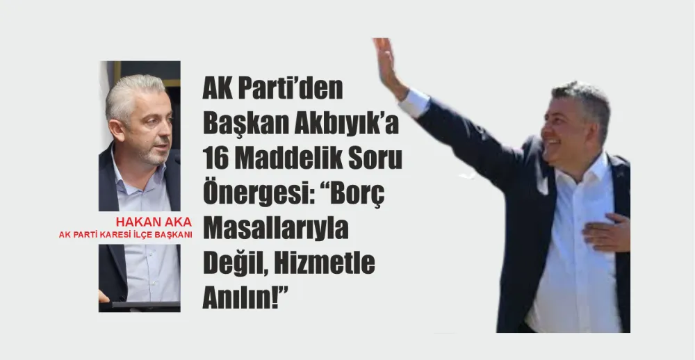 Karesi Belediye Meclisi’nde AK Parti Grubu, Belediye Başkanı Mesut Akbıyık’a yönelik 16 maddelik kapsamlı bir soru önergesi sundu. 5393 Sayılı Belediye Kanunu’nun 26. maddesine dayanarak sunulan önergeyle, belediyenin mali yapısı, taşınmazların akıbeti, icraatların durumu ve kamuoyunda konuşulan bazı iddiaların netlik kazanması talep edildi.