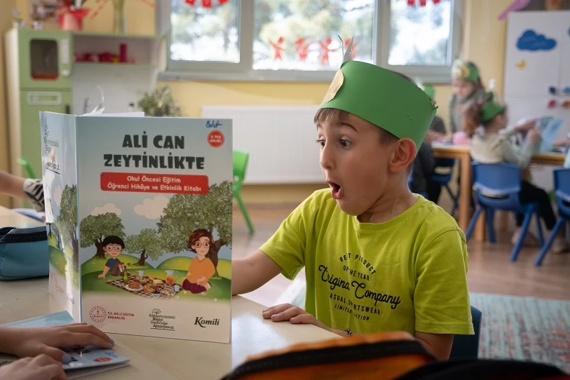 Okul Öncesi: Alican Zeytinlikte hikâye ve etkinlik kitabı, oyun kartları, öğretmen kılavuz kitabı, zeytin ağacı yaşam döngüsü afişi.